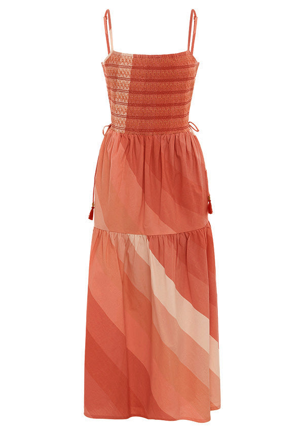In an exclusive tonal yarn dye stripe fabric, the Circe Midi Dress is a spring weekend essential. Feel effortless in this smocked bodice, midi length, dress. Featuring detailed patterned stitching, practical side pockets, and unique MOS details ~ pair with a chunky sandal for everyday or a colourful heel for your next event.