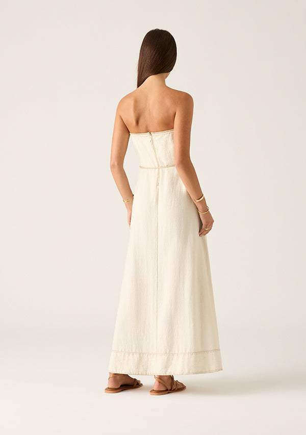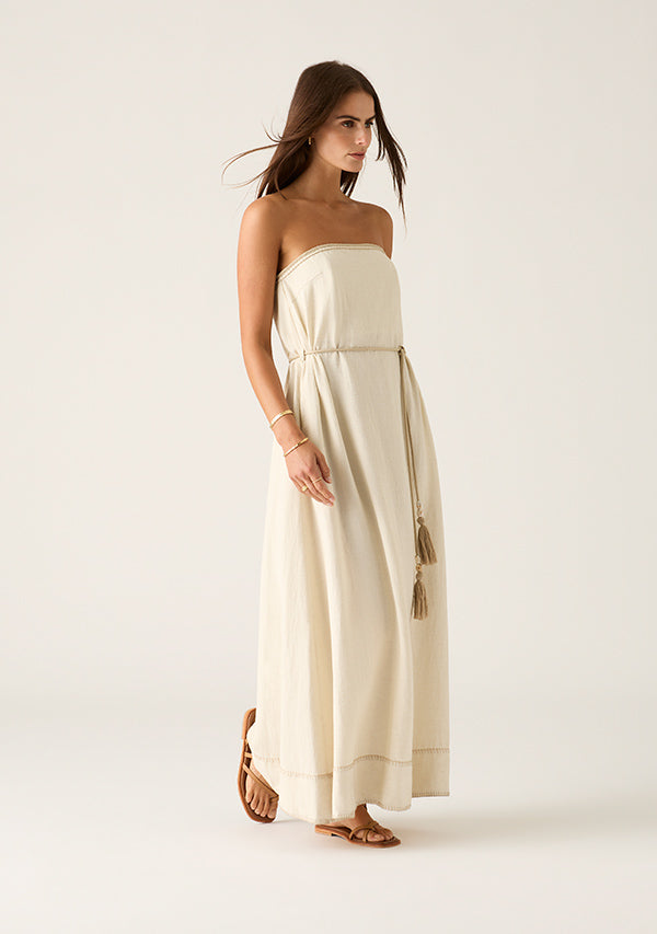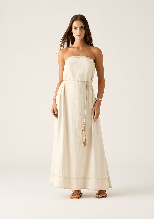 Relaxed in its lightweight shaping, this strapless maxi dress delivers dream summer styling in cream, accentuated by feature tonal detailing at the neckline and statement stitched broad hem. Worn loose or cinched at the waist using the rope tie belt finished with shell beading and tassels, the dress is completed by a gold centre-back zip and handy pocketing at the hip. Our eCommerce model, Alana, is 175cm tall with a 82cm bust, 61cm waist, 89cm hips, and wears a size 8. Tonal light strapless maxi dress with bonding for smooth fit Removable plaited belt with shell detail beaded finish Seam finish with sewed pintuck finishes Gold centre-back zip Internal pockets at hip 67% Rayon, 21% Nylon, 12% Linen